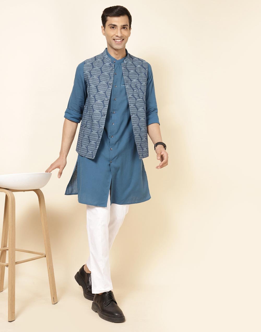 1 review for NUIndian Blue Cotton Geometric Printed Slim Fit Nehru Jacket